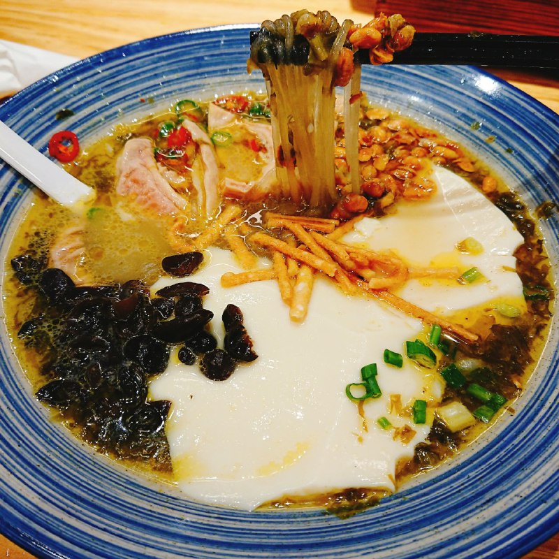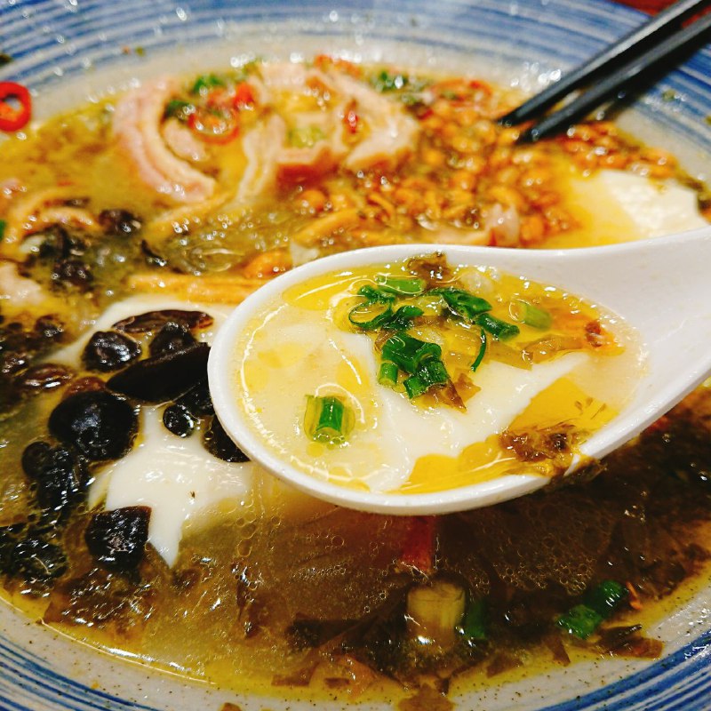地铁一号线火车南站下车,凯德广场负一楼的甘食记肥肠粉,特点肠头酸汤粉,汤底浓郁酸香开胃,亮色清亮,豆花白嫩入口即化,用勺子一舀,就汤吸入,幸福感爆棚,微辣,料多,粉是新鲜手打,粉入味柔软有弹性。一份量足够大。肠头份量足,干净无腥味,嚼劲十足。