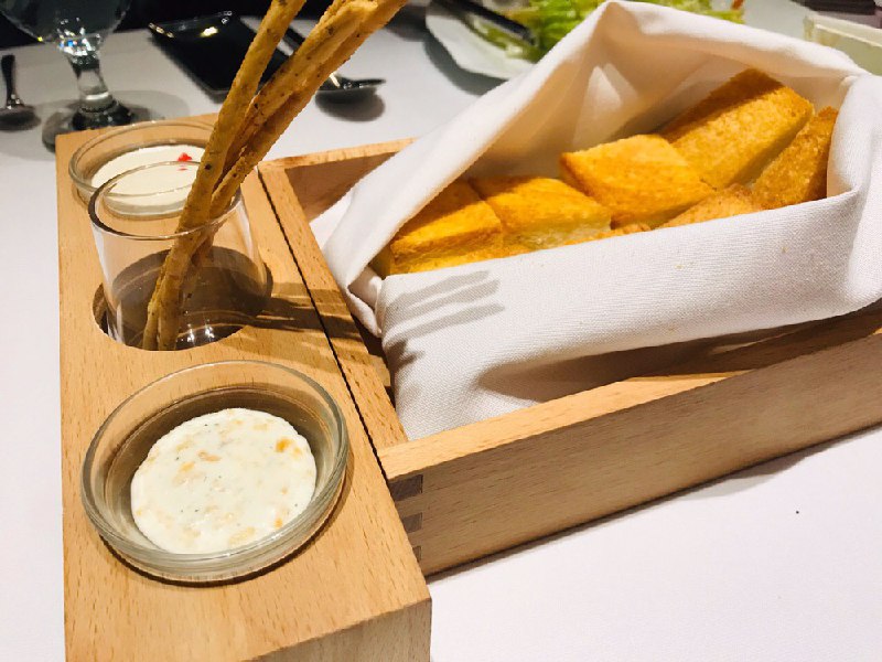 餐前包烤制的很酥脆,端上来时用布包裹着,搭配的酱我建议是选择图中面前的银鳕鱼酱,第二种是蒜香乳酪酱,有点冲鼻子了hhhh