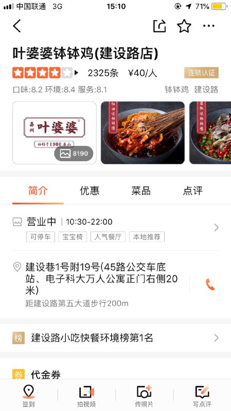 位于建设巷靠路东侧,近公交45路建设巷总站。乐山叶婆婆钵钵鸡在成都的分店之一,跟一堆好吃的店铺开在一起。汤料红油和藤椒各有特色。红油泡的荤菜(鸭肠除外),藤椒泡的素菜(个人认为藤椒的魔芋、凤尾、西兰花)都非常好吃,不够吃随拿随泡。夏季有专供传统冰粉(冰粉+红糖,不加其他佐料),还有鸡汤饭值得一试。