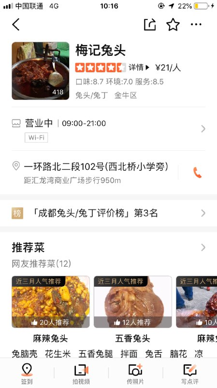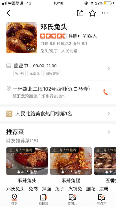 位于一环路北二段,近白马寺街西北口。两家卤兔头、兔腿的小店开在一起,挨在一起,相爱相杀多年依旧在一起。兔兔那么可爱,当然要卤了吃啦!五香、麻辣兔头是两家店的到店必选!五香较为清淡,适合不太能吃辣的人。兔腿个头不大,但很紧实,同时价钱也比兔头贵一点儿,强烈推荐兔肉爱好者尝尝。